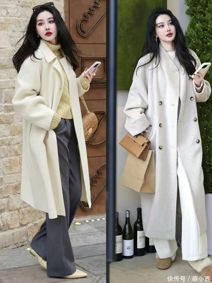 如果是日常搭配,西装阔腿裤和牛仔阔腿裤都可以搭配奶奶大衣,阔腿裤的干练感能中和“奶奶大衣”的厚重,无论是搭配小白鞋还是短靴,都显利落又显高,通勤穿超合适。