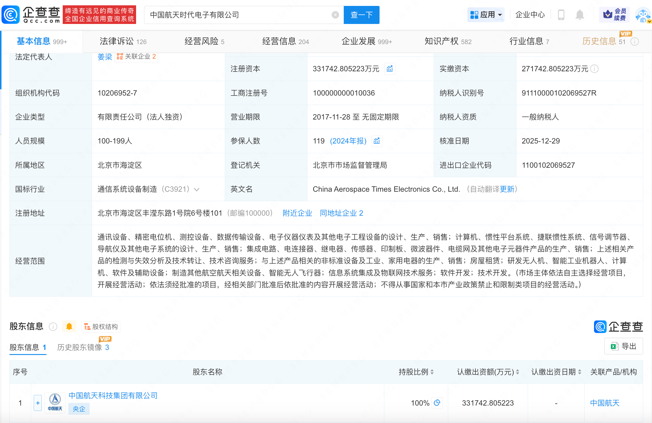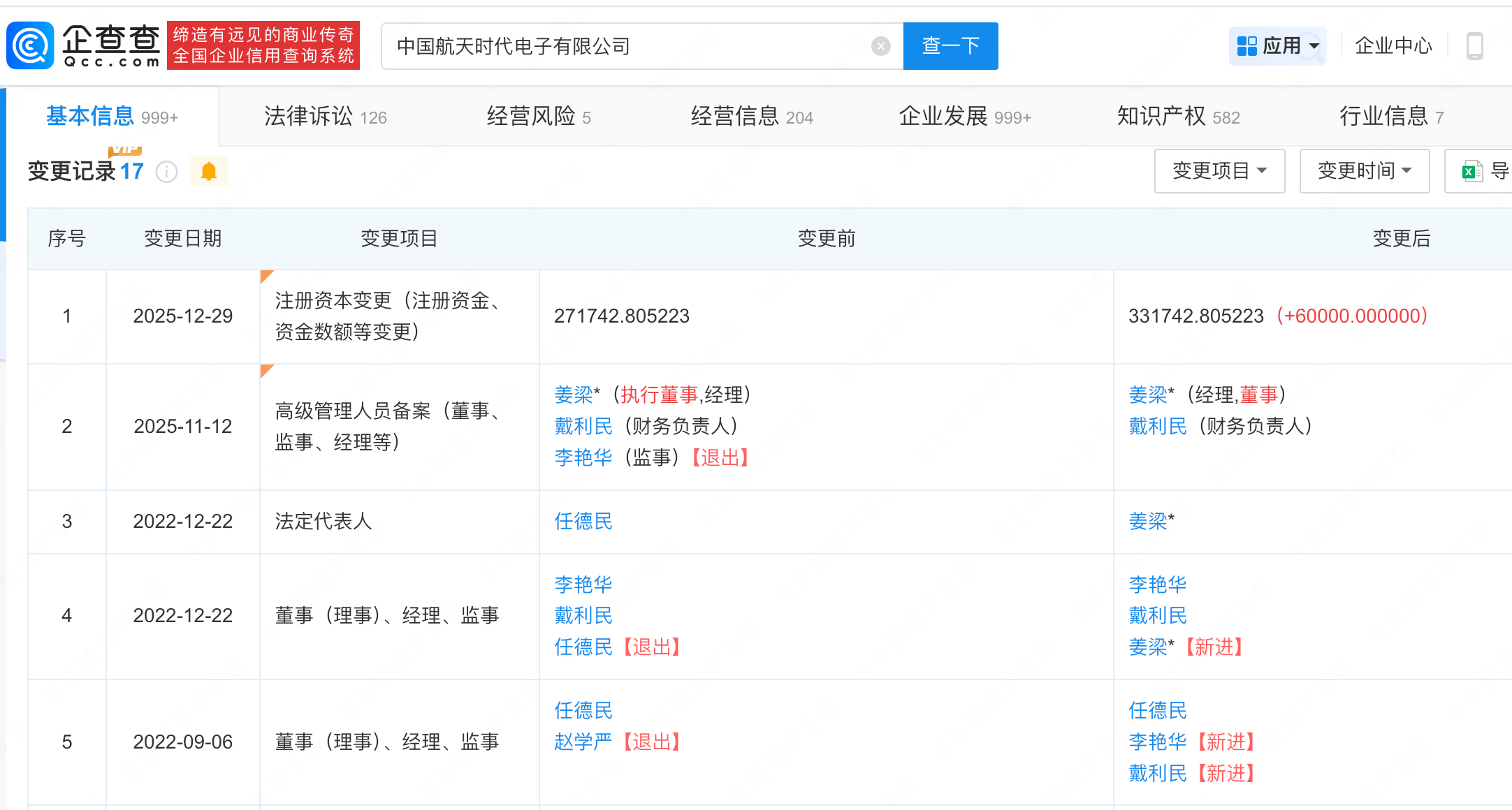 近日,中国航天时代电子有限公司发生工商变更,注册资本由约27.2亿人民币增至约33.2亿人民币,增幅约22%。企查查信息显示,该公司成立于1989年4月,法定代表人为姜梁,经营范围包括通讯设备、精密电位机、测控设备、数据传输设备、电子仪器仪表及其他电子工程设备的设计、生产、销售等,由中国航天科技集团有限公司全资持股。
