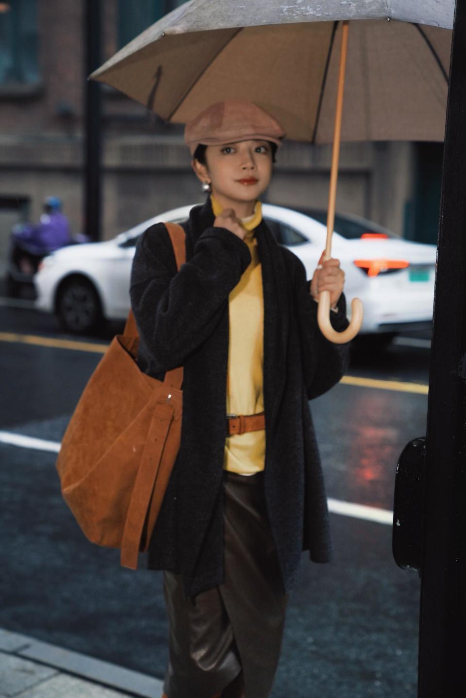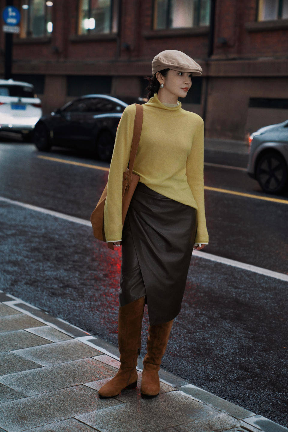 大家有没有发现她下面这一套穿衣也同样是选择黑色的皮质半身裙来搭配,那就是黑色的衣服搭配任何颜色都可以,所以她选择了一件浅黄色的薄款针织上衣来穿搭,头上戴了一顶平顶帽,你还真别说,这样的穿衣打扮变得温柔得体又不失时尚感。