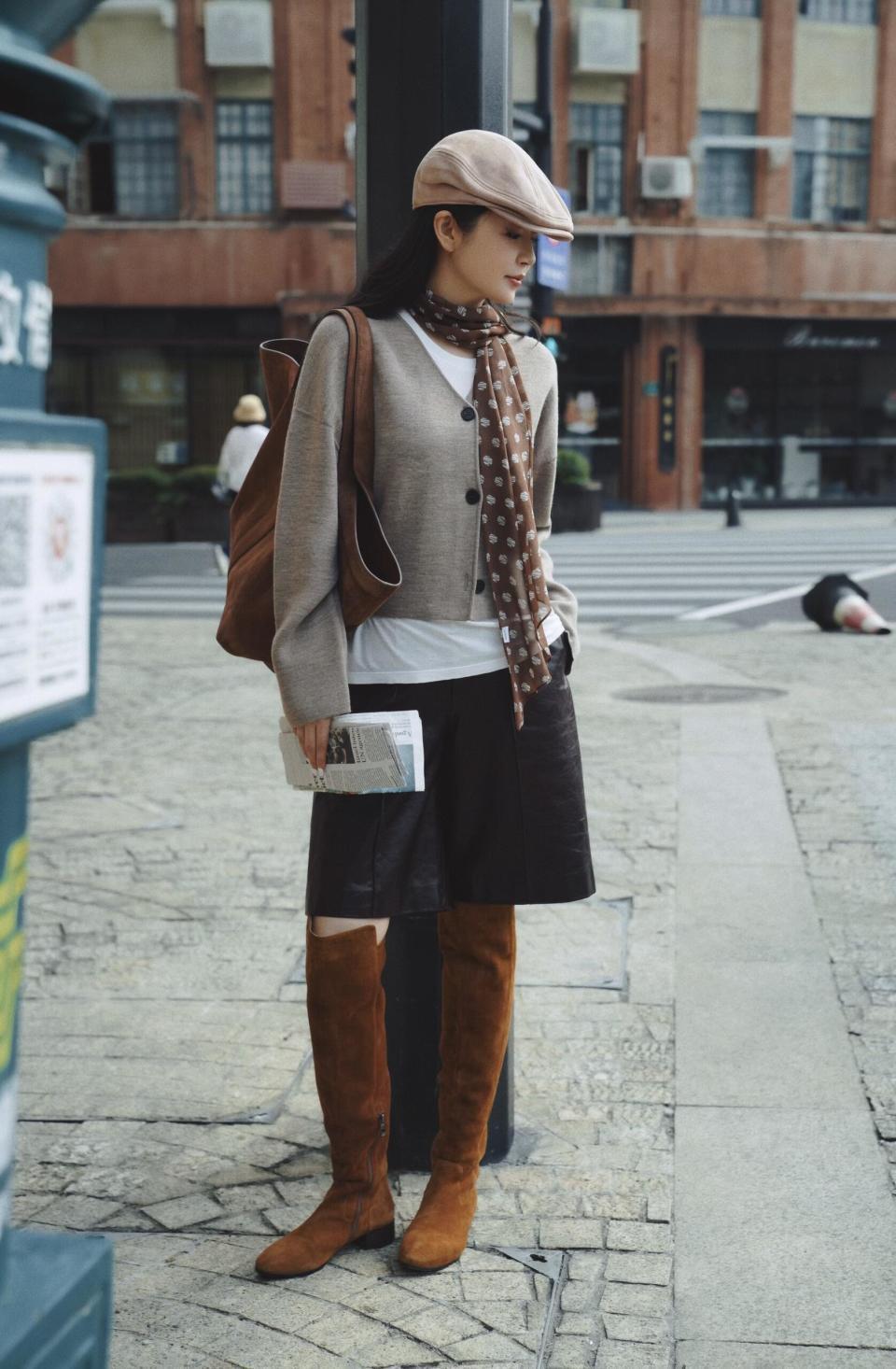 大家有没有发现,同样是一套衣服,是搭配细节上有点区别,瞬间气质就不同,比如下面这套没有把内搭的针织衣服衣角塞进裙子里面,但是加上了一条棕色的腰带,也是能很好的提升腰线,还能达到点缀的效果,包括帽子也不同,搭配出来的气质完全不一样。