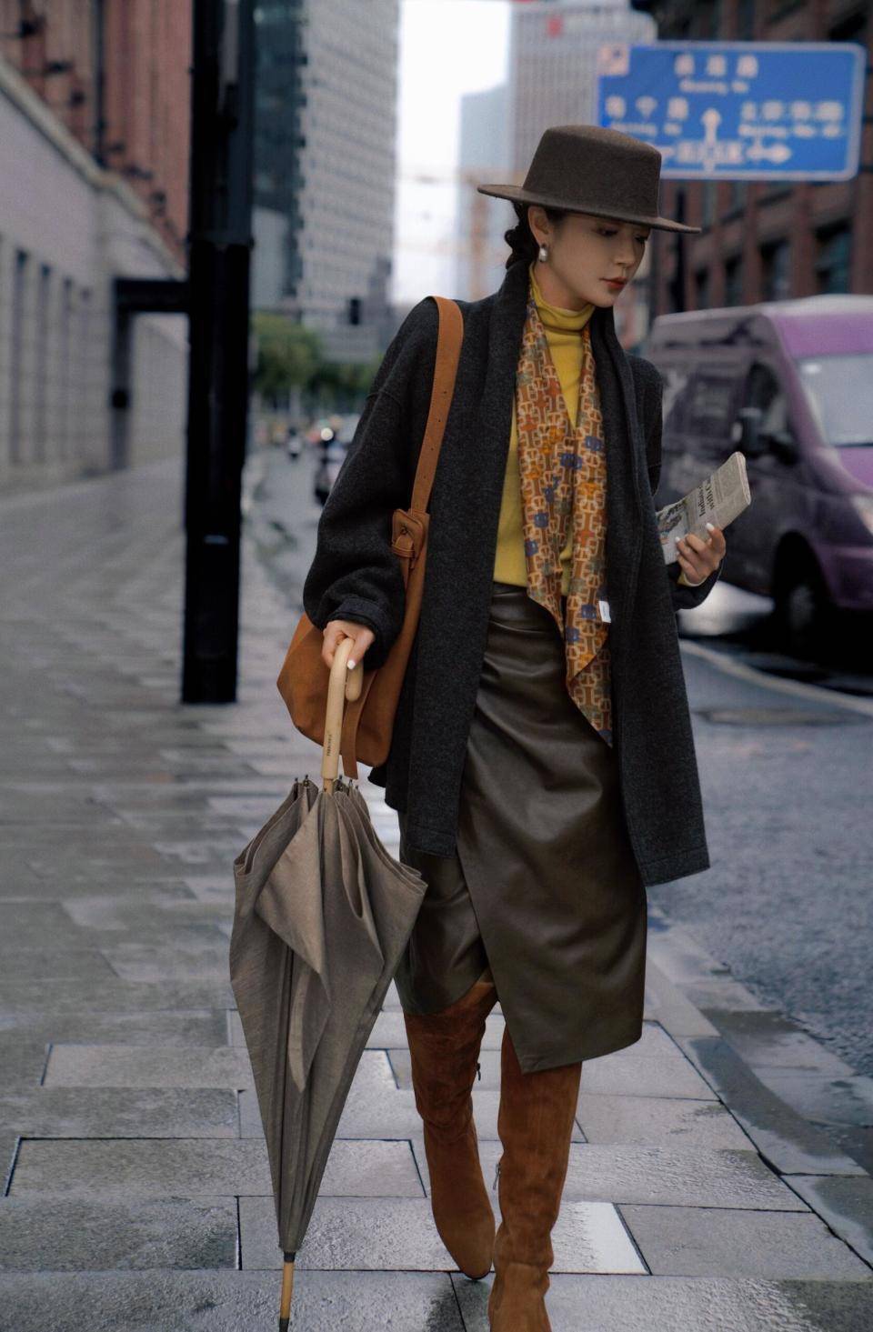 最主要的还是色彩搭配,例如下面这件黄色的外套,其实普通大众女性很难驾驭的住,她选择的内搭是那种深军绿色的针织衣服,加上咖色的皮质半身裙,还有驼色的中筒靴,整体的色彩搭配才有那种经典的感觉,正常情况下来说不推荐你选这样的黄色外套。