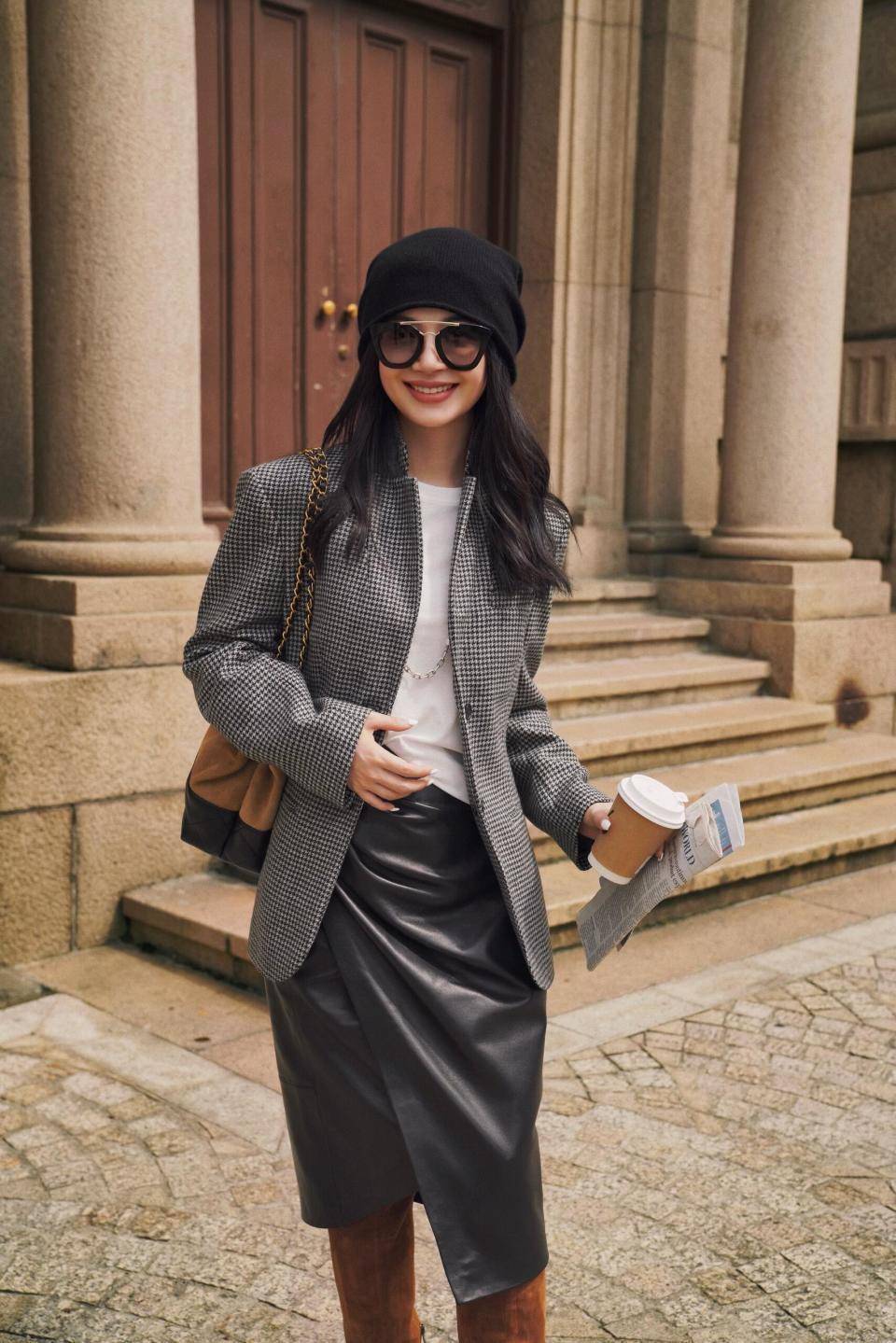 用的是一件格纹的灰色外套,内搭一件白色的短袖T恤,下半身选择的是黑色的不对称皮质半身裙,脚上穿的是一双驼色的中筒靴,头上戴了一顶针织帽,这样的穿搭简约大气,同时保暖又舒适。